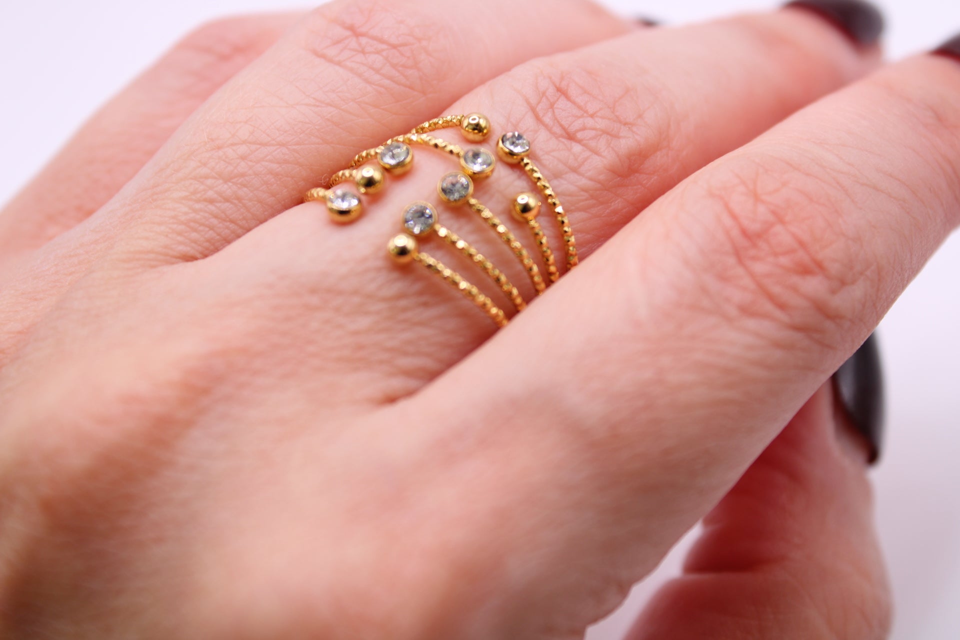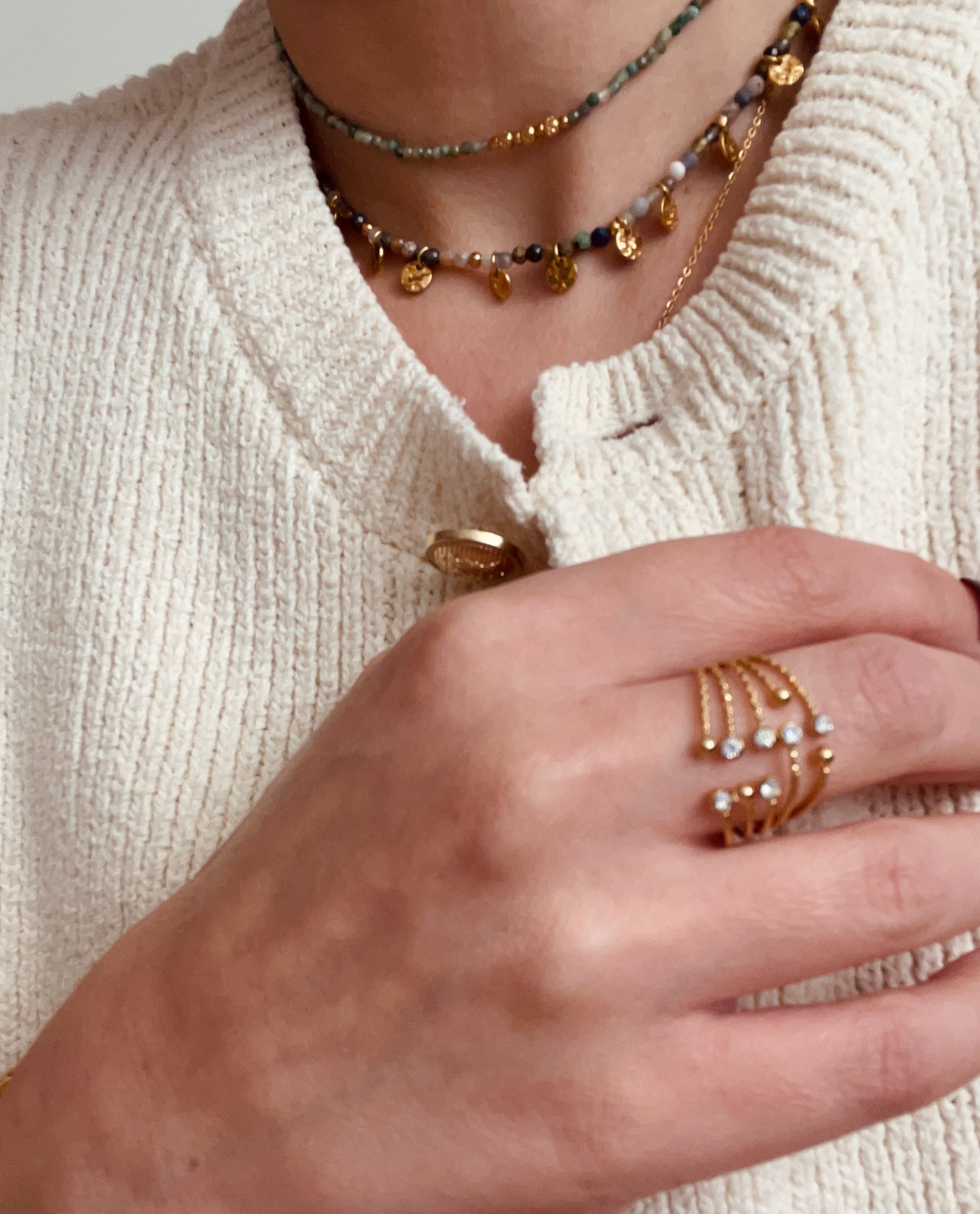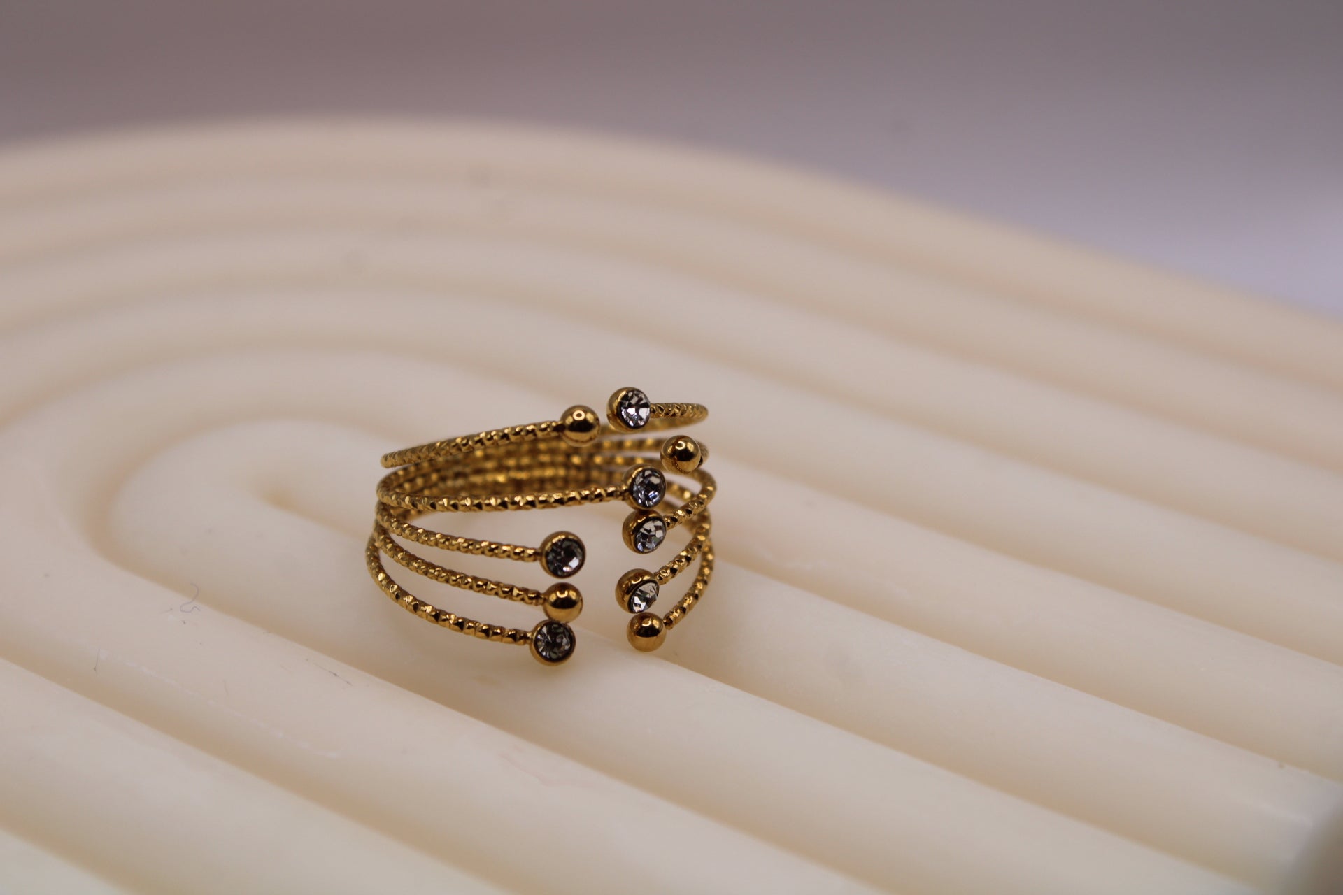 Laissez-vous séduire par la finesse et l'originalité de la bague Tiziana. Composée de plusieurs anneaux délicatement entrelacés en acier inoxydable doré, cette bague se distingue par ses petites perles dorées et ses strass lumineux, qui captent la lumière pour un effet scintillant. Son design ouvert et ajustable assure un ajustement parfait à toutes les tailles de doigt, vous permettant de l’adapter à votre style personnel. Un bijou unique qui marie élégance et modernité, parfait pour toute occasion.