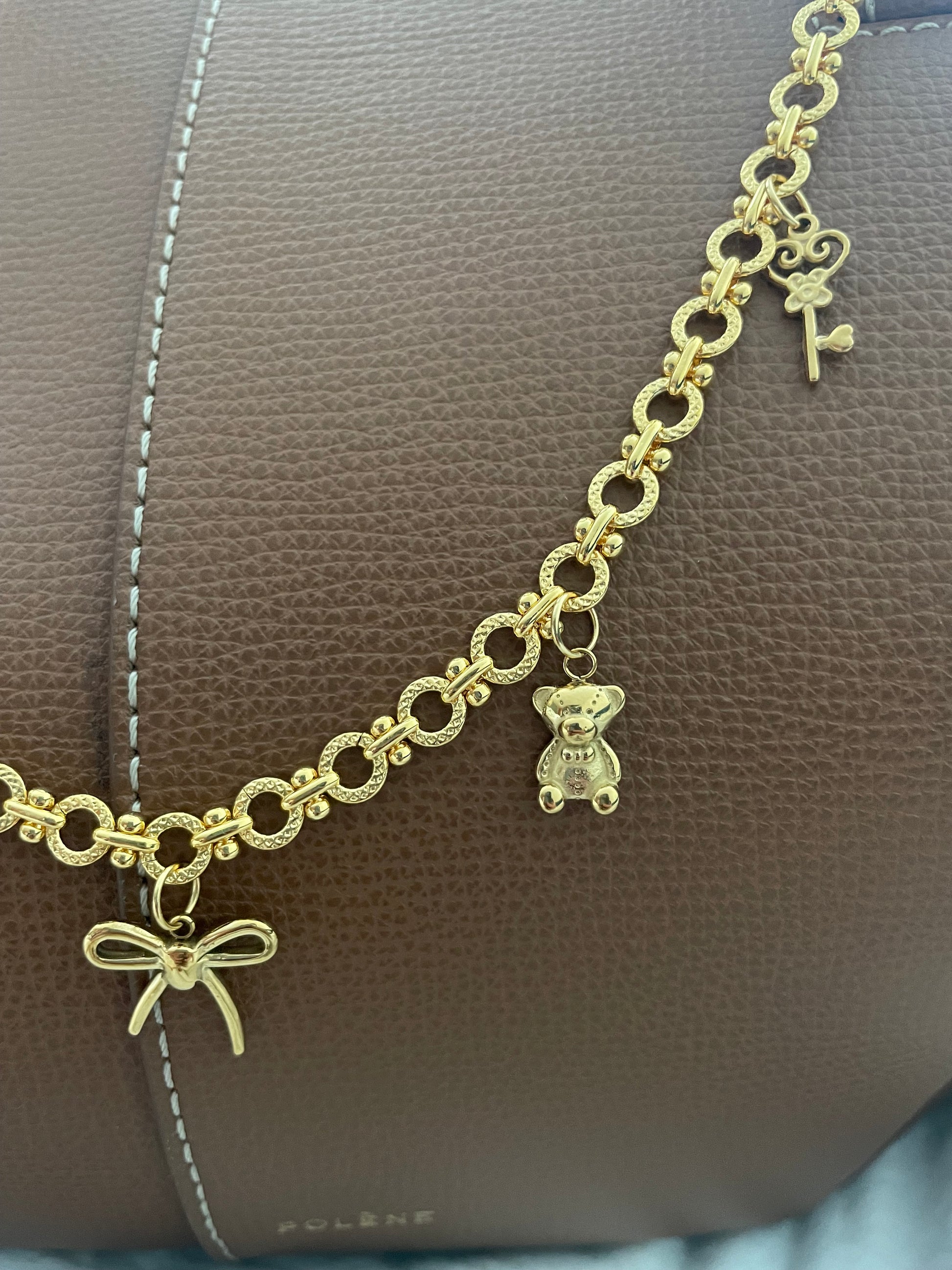 Bijou de sac fait mains , chaîne martèle avec motifs travaillés en laiton et charm’s acier inoxydable( botte, yin yang ,noeud, ourson et clé). Doté des mousquetons aux extrémités ainsi que des anneaux ronds d’échange afin de s’adapter aux différents type de sac .
