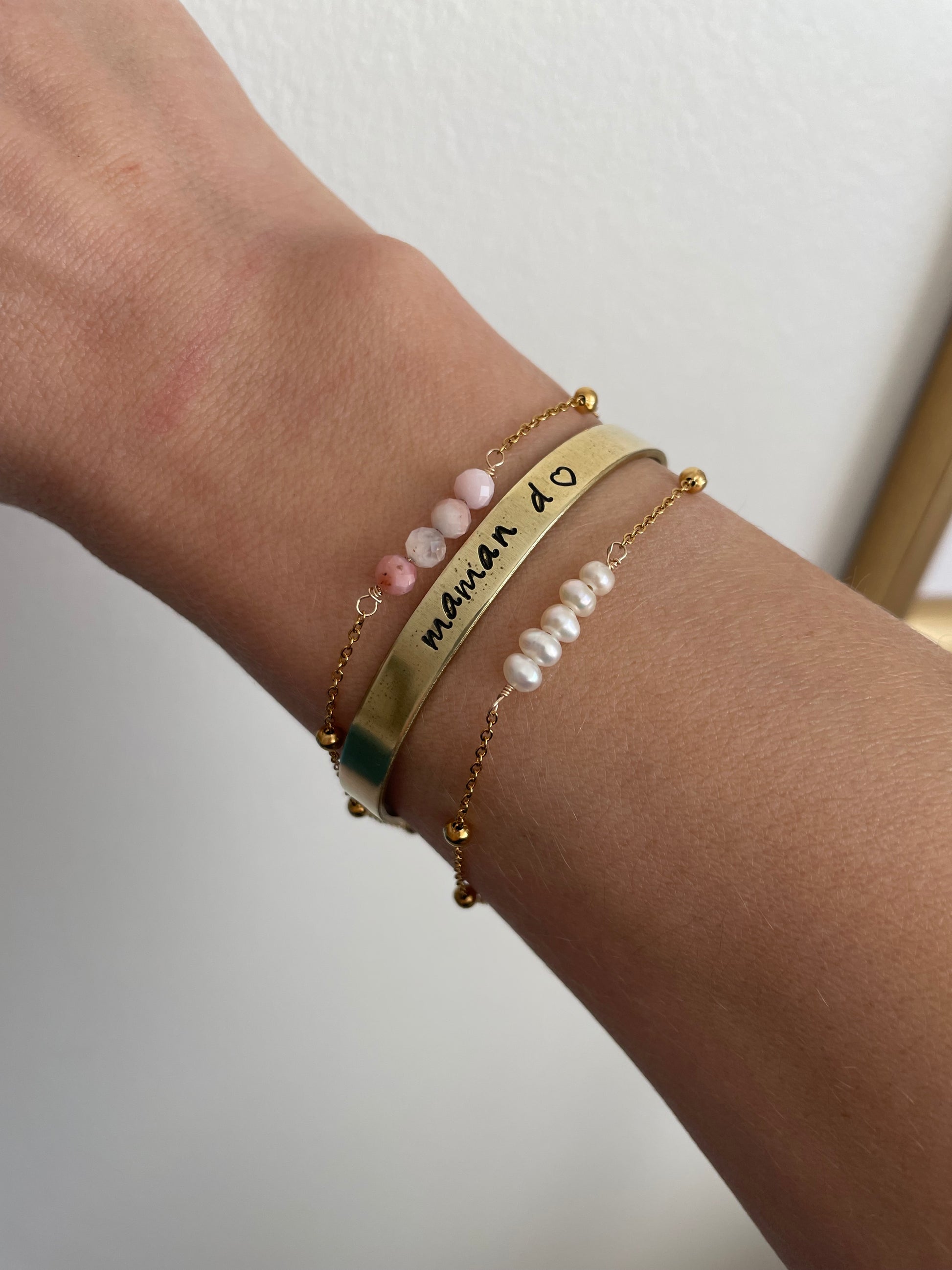 Parfait pour un cadeau à un être cher ou à vous-même. Vous désirez le personnaliser avec un prénom, une date ou des initiales ? Tout est possible, limité à 15 caractères (lettres et/ou chiffres, face extérieure et inférieure). Le bracelet est en laiton et estampé à la main, respectant les procédés artisanaux, ce qui le rend authentique et unique 🤩.