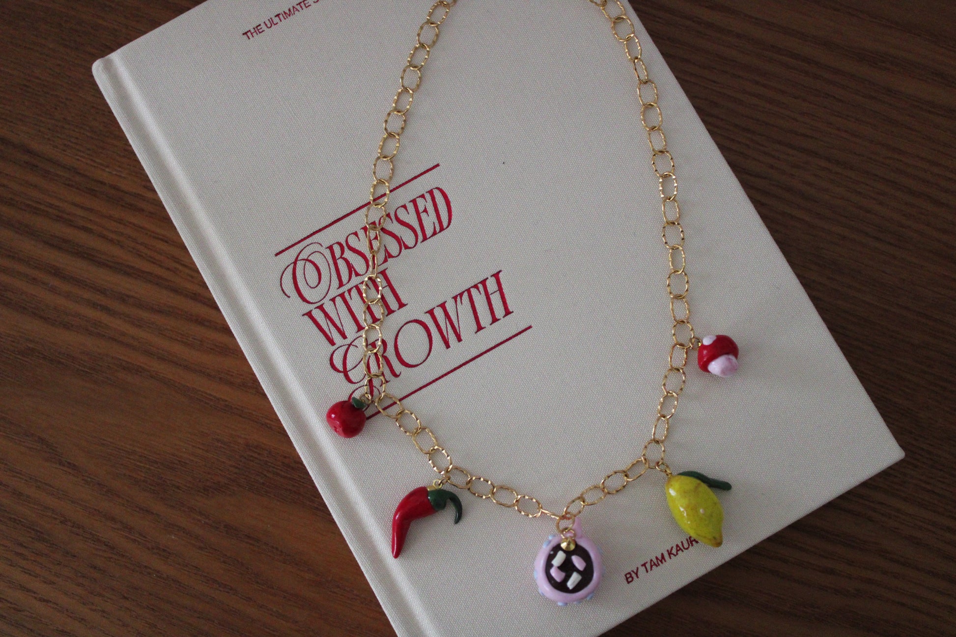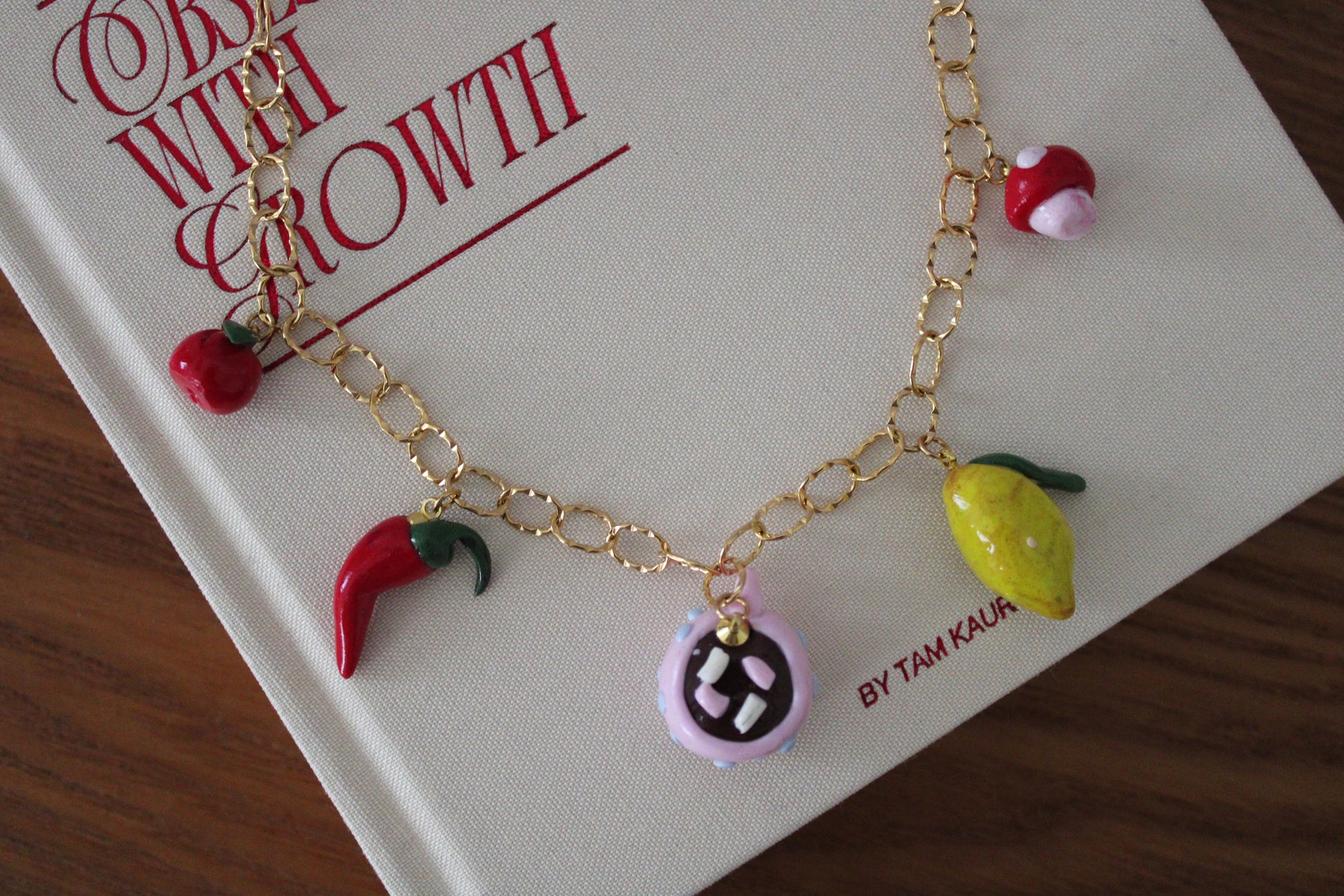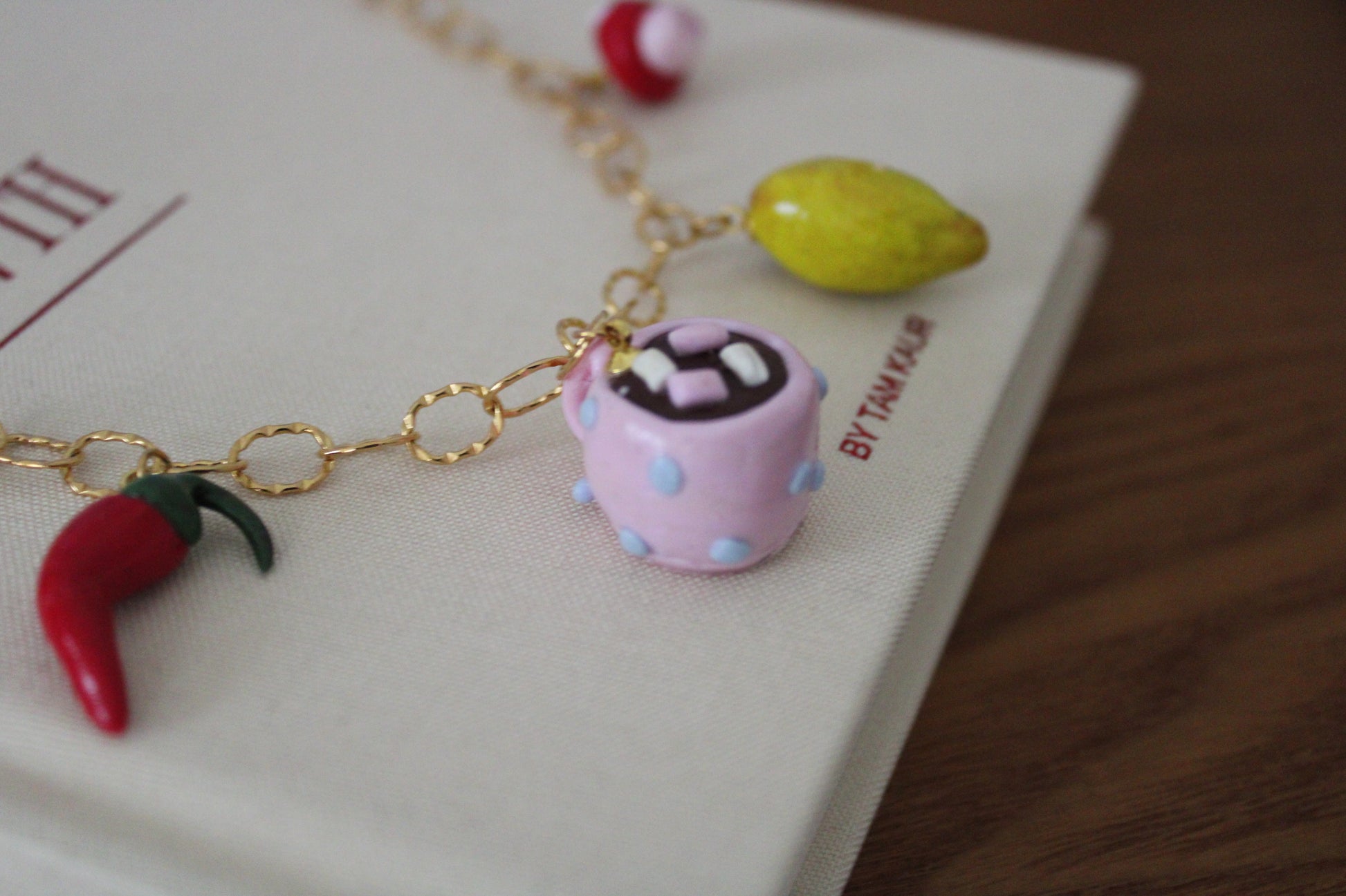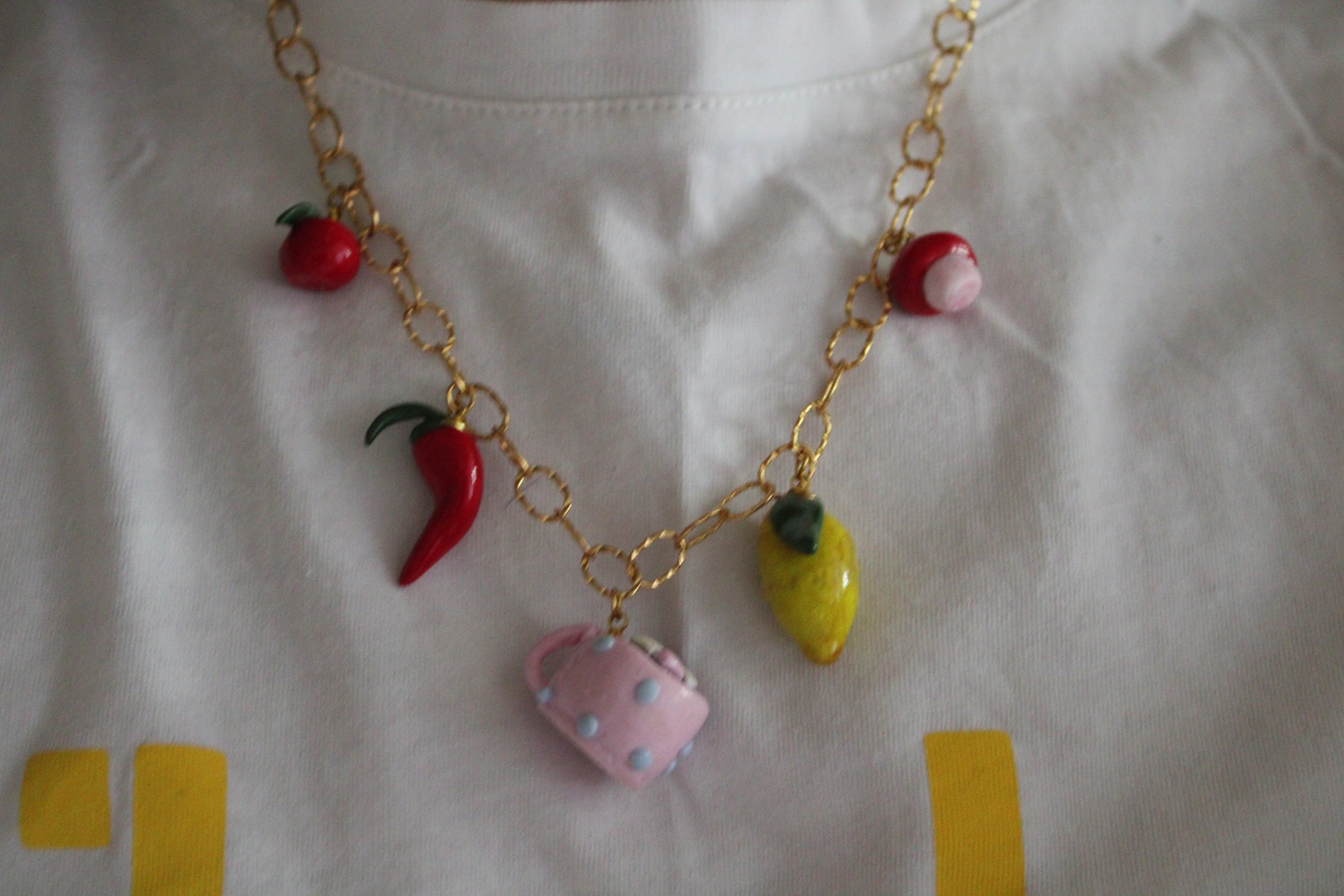 Collier en acier inoxydable et charm’s polymère faits main et vernis : pomme , citron , tasse chocolat chaud, piment et champignon
