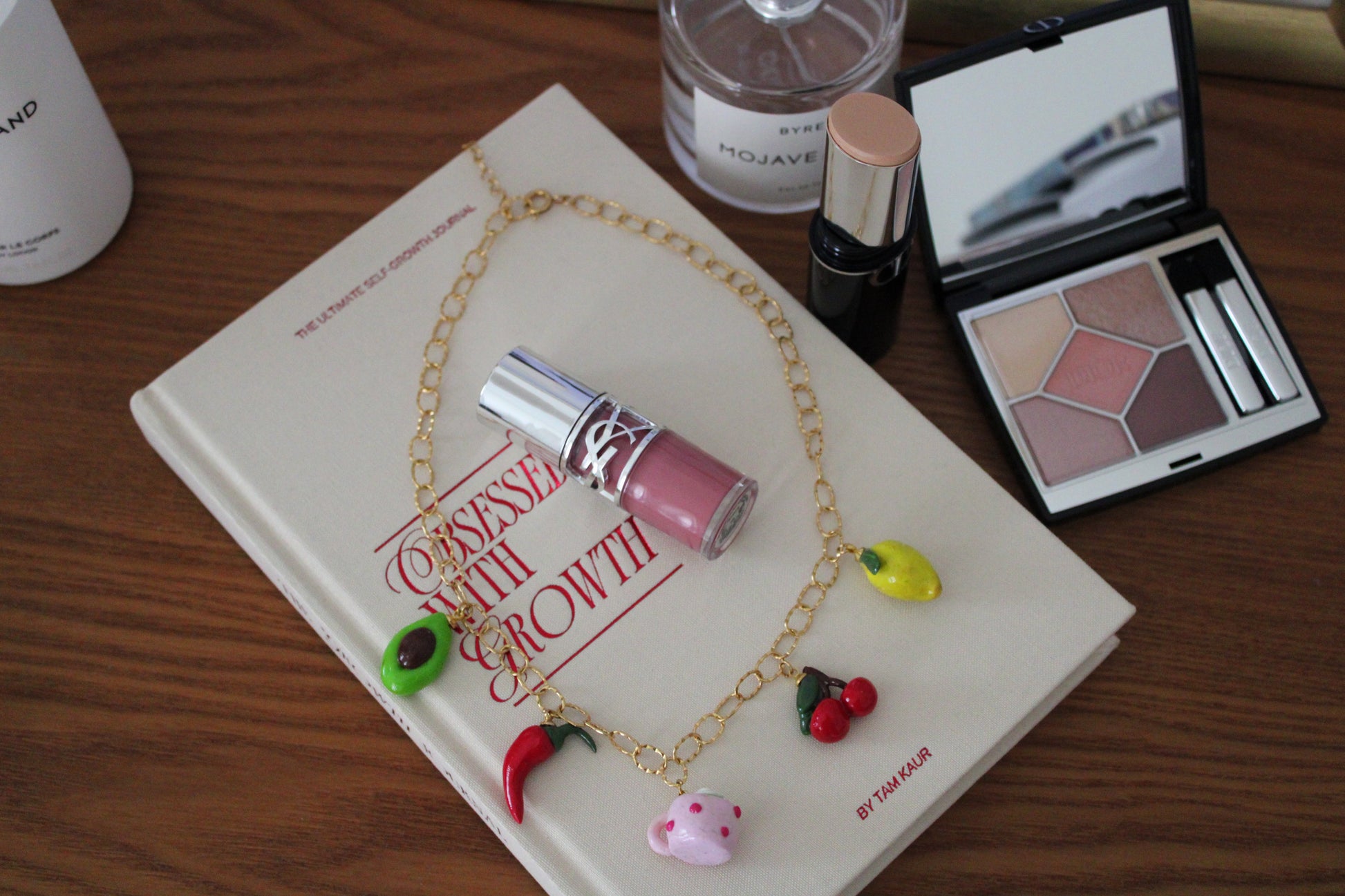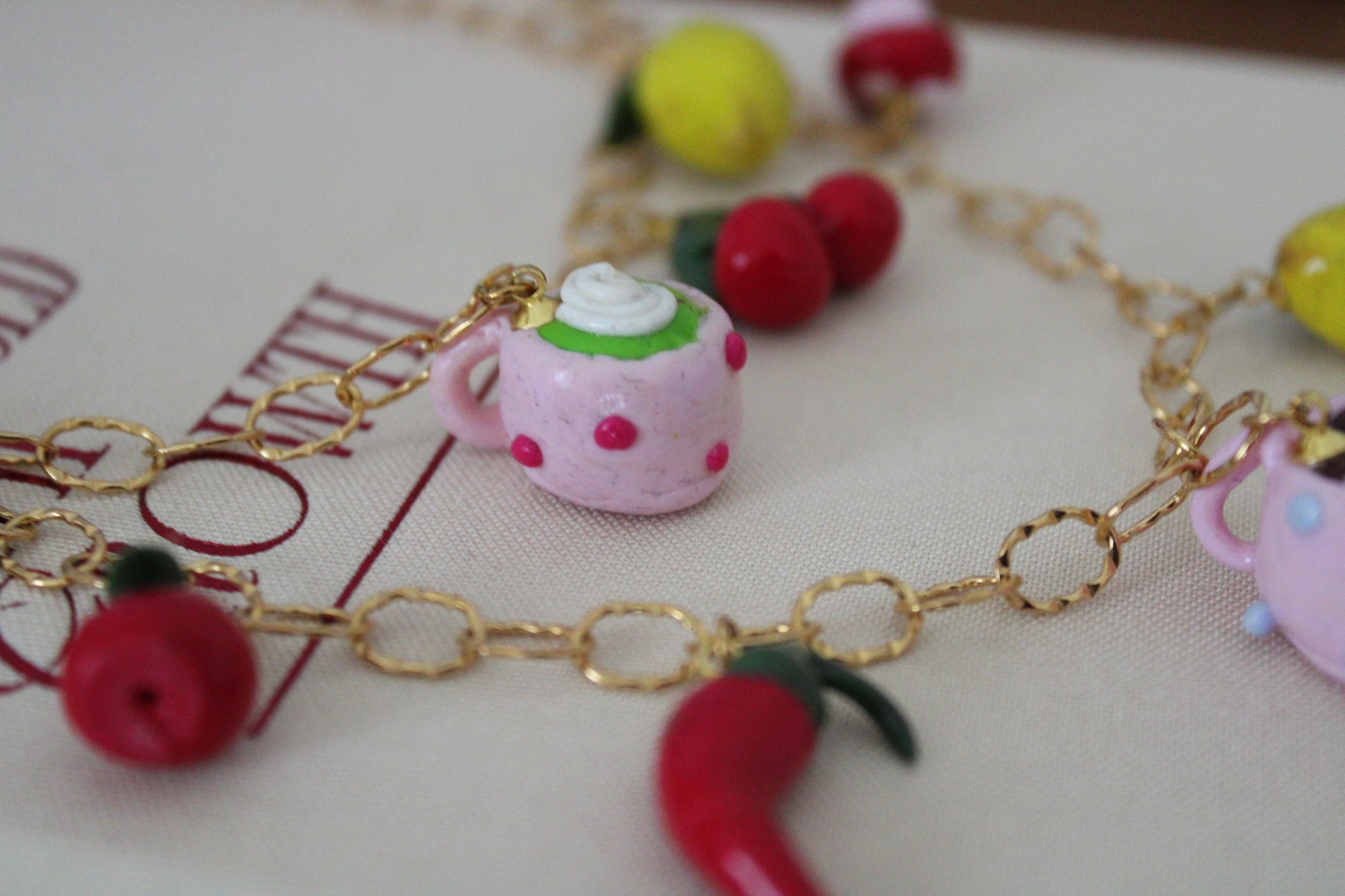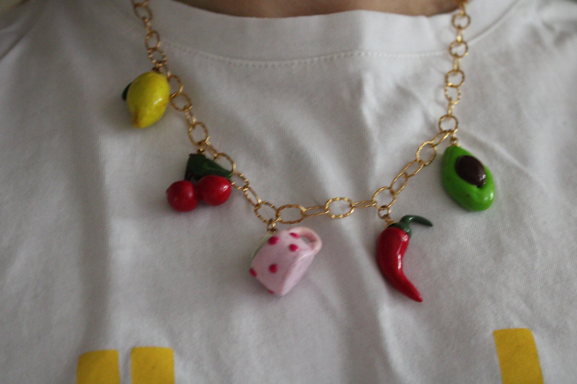 Collier en acier inoxydable et charms en polymĂšre faites main et vernis : avocado , piment , tasse matcha ,cerise et citronÂ