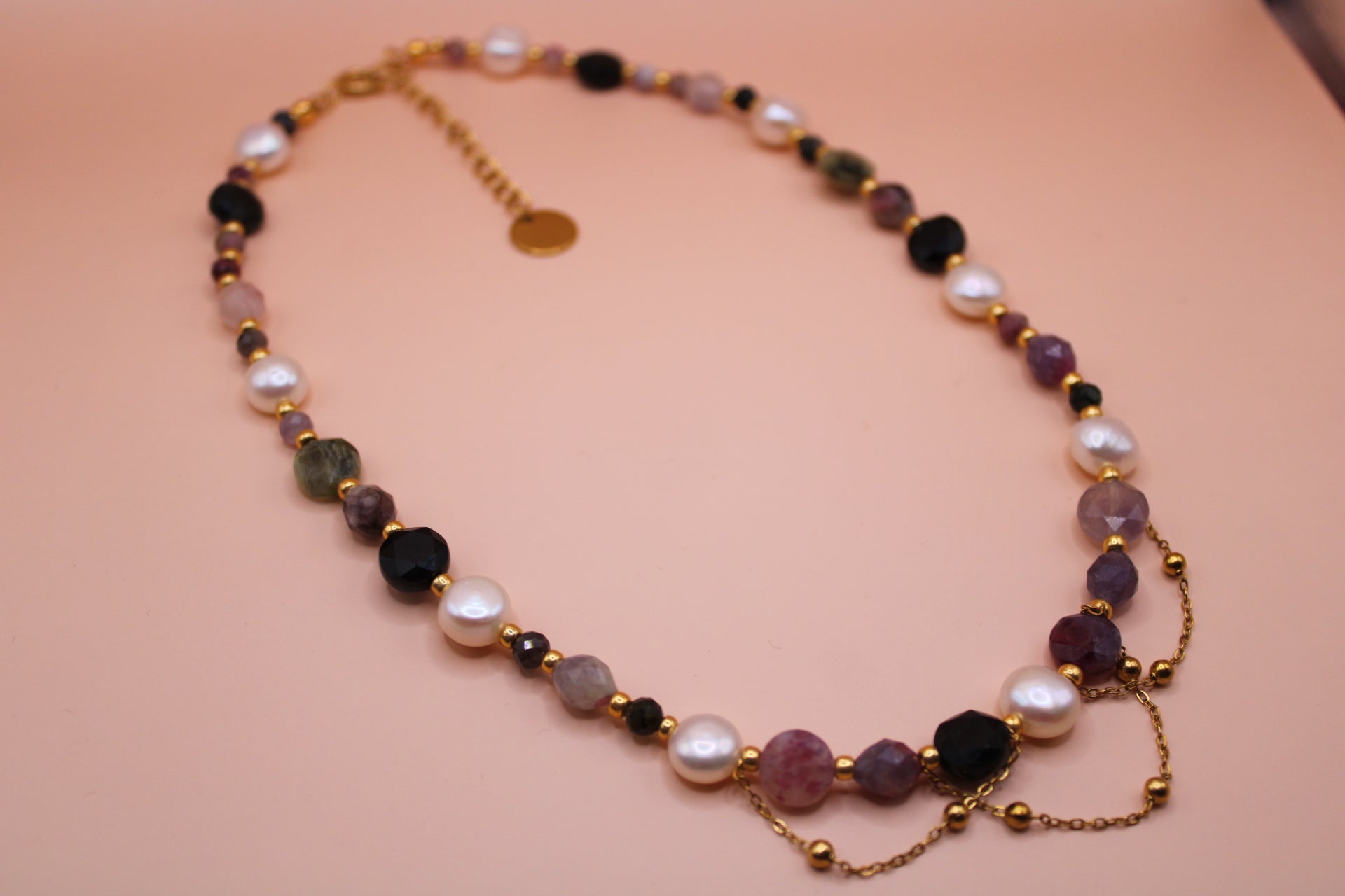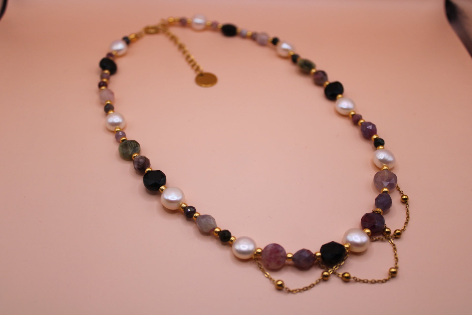 Le collier Thalia en pierres naturelles et acier inoxydable est entièrement fait à la main, monté sur un fil câblé. Les pierres naturelles de tourmaline (palets, fleurs de figuier et perles rondes facettes), les perles de culture d'eau douce en forme de bouton, les perles dorées Miyuki et la chaîne pendante en acier inoxydable lui confèrent une élégance insolite. Avec sa chaînette d'extension de 6cm, vous pouvez ajuster sa longueur de 40cm à votre guise. Chaque collier est unique avec ses variations de couleurs de pierres naturelles, ce qui en fait une pièce de collection raffinée.