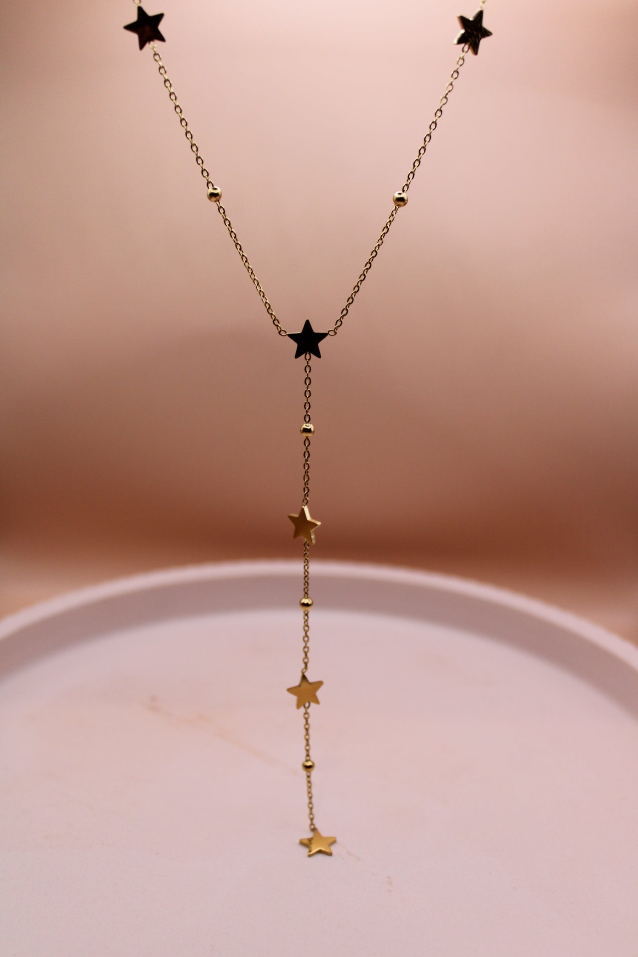 Composé d'une chaîne en acier inoxydable ornée d'étoiles dorées, il est parfait pour sublimer le décolleté. Sa finesse et son design raffiné en font un accessoire idéal pour les fêtes, mais aussi pour ajouter une note sophistiquée à vos looks du quotidien.