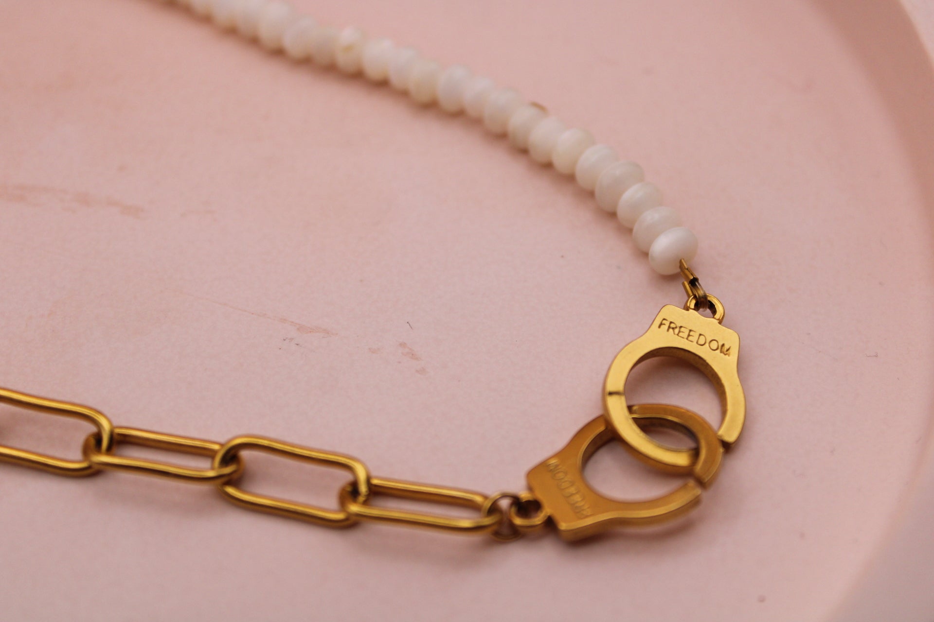 Le Collier Yin&Yang combine des perles de verre délicates et une chaîne de grosse maille en acier inoxydable, maintenus ensemble par des menottes.