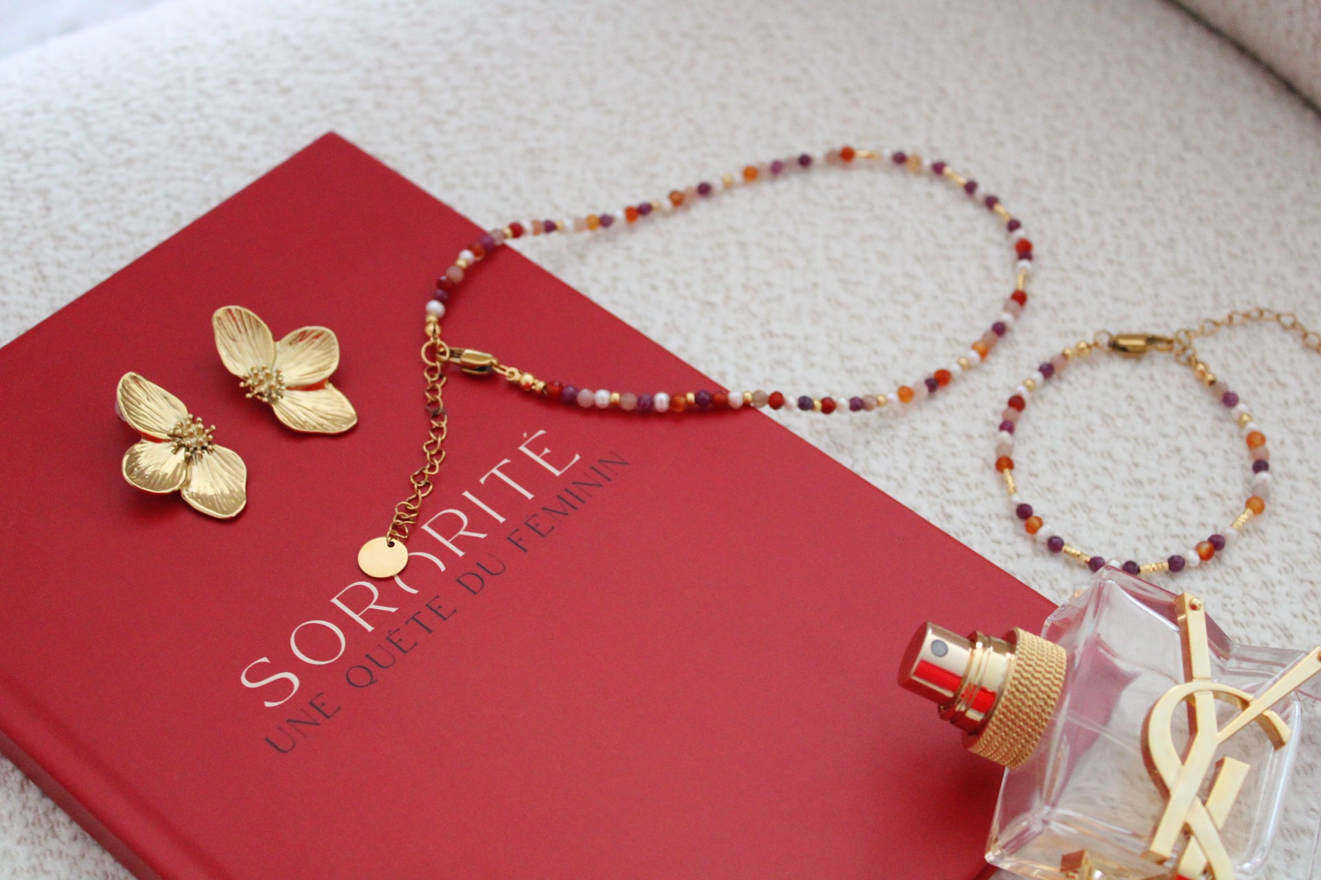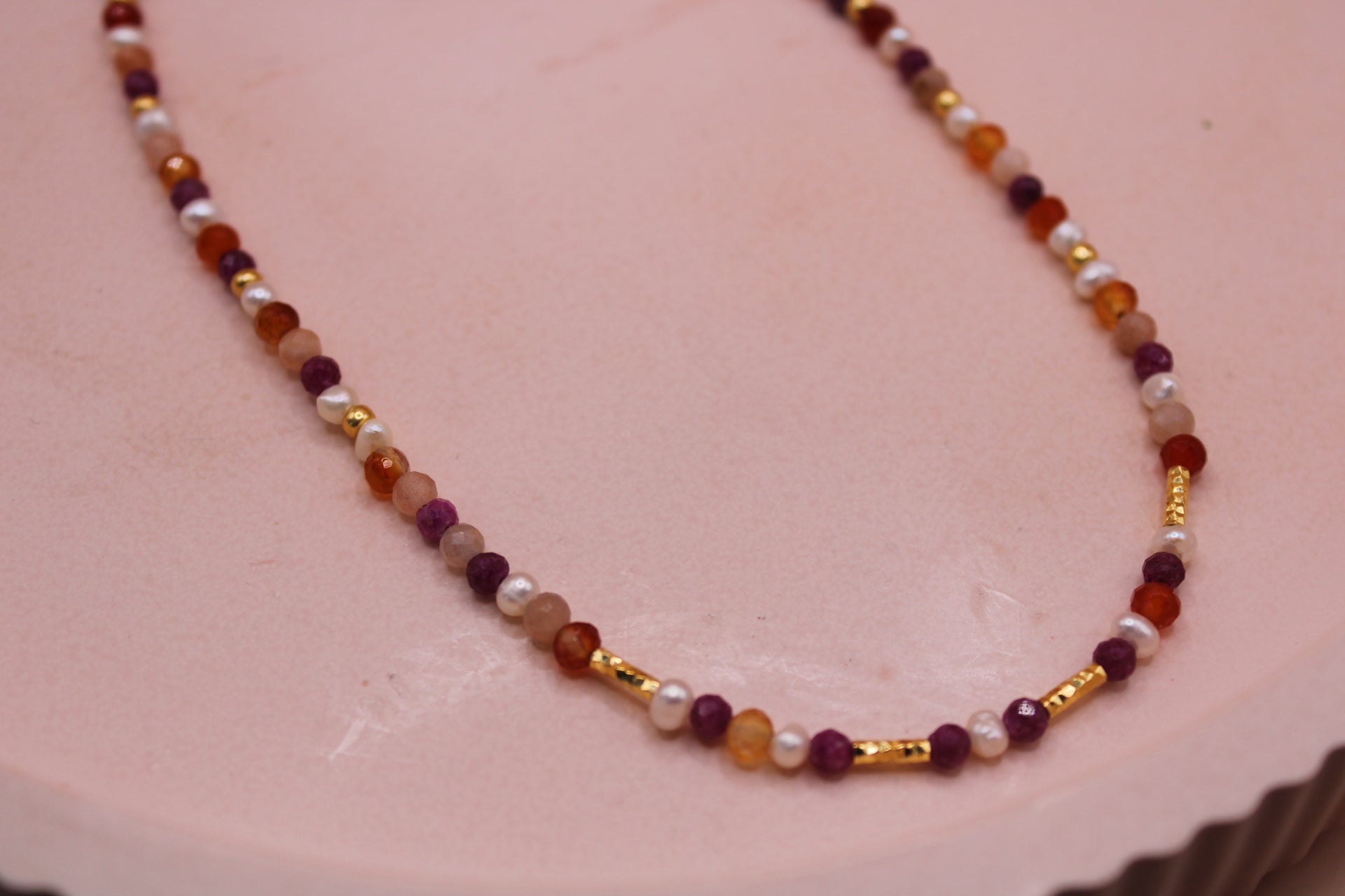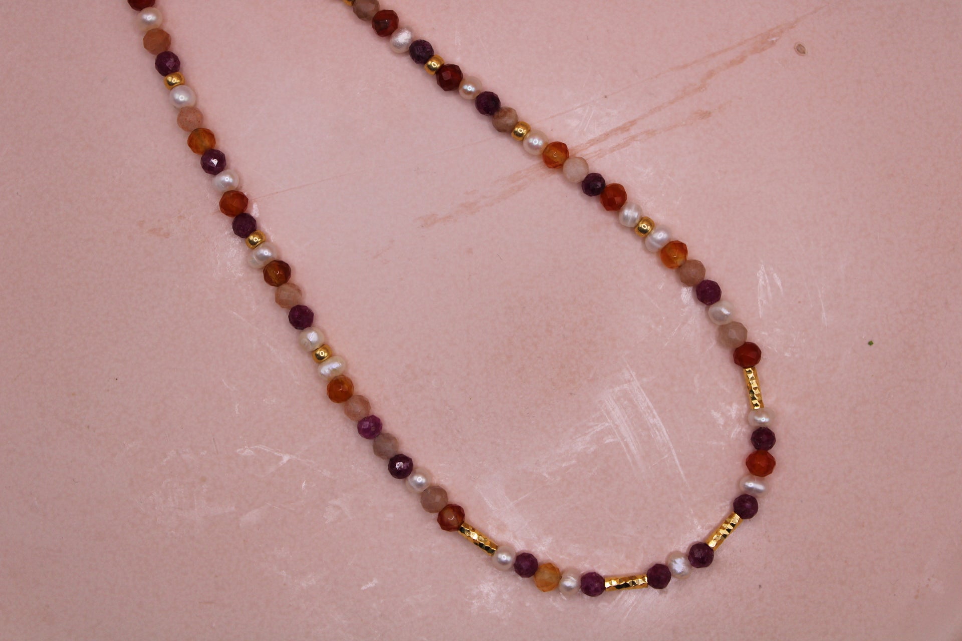 Ras de cou en pierres naturelles (rubis, cornaline , pierres de lune), perles de culture , perles Miyuki et tubes argent doré à l’or fin .
